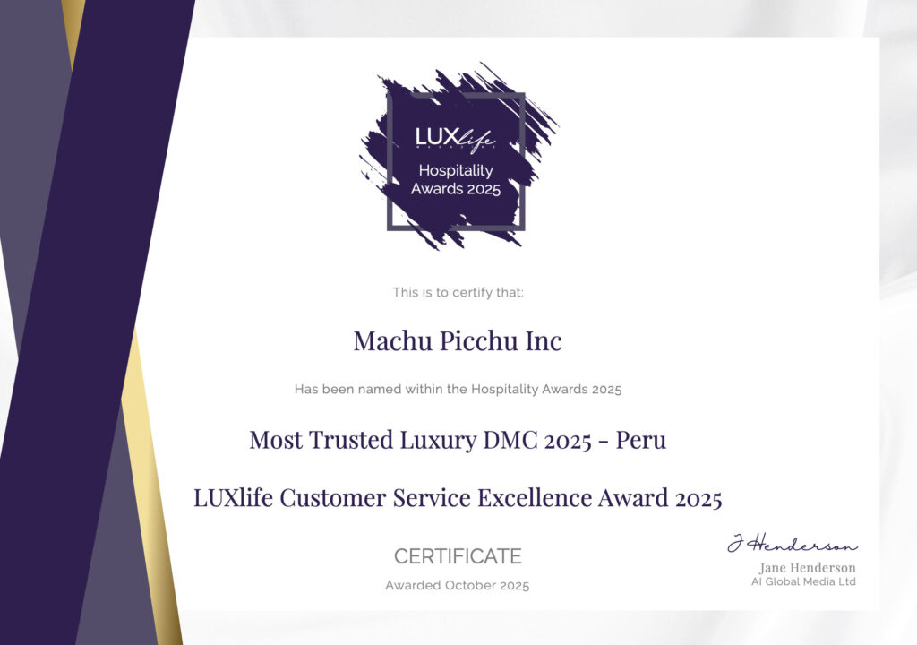 In the ever-evolving world of luxury travel, few recognitions carry as much prestige as the LUXlife Hospitality Awards — a program that celebrates the best in service, experience, and excellence across the global travel industry. This year, Machu Picchu Inc proudly stands among these distinguished names, having been awarded “Most Trusted Luxury Destination Management Company (DMC) for Peru” by LUXlife Magazine.