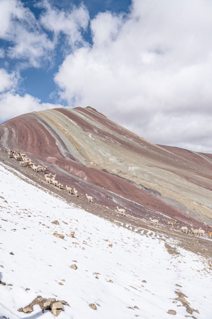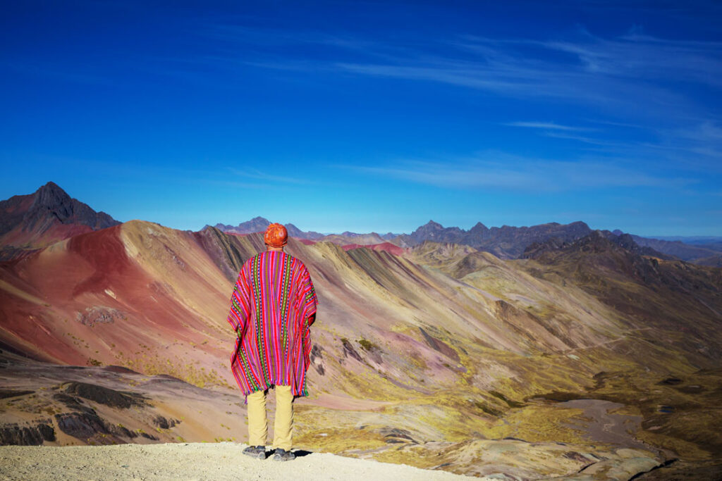 Reaching the summit reveals a panorama like no other: a mountain painted by nature herself. Shades of red, turquoise, gold, and lavender sweep across the ridges, creating a surreal tapestry against the backdrop of the majestic Ausangate Glacier, one of the region’s most sacred peaks.